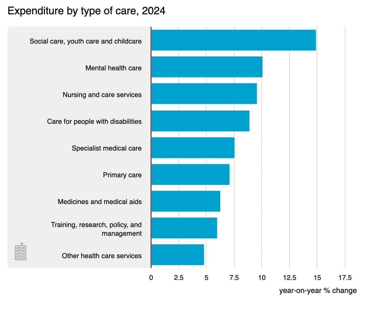 Total spending on care services grew much faster than the economy and now accounts for nearly 14% of GDP. Taken together, all forms of care cost an average of €8,610 per person last year – an increase of €654 compared with 2023, the CBS figures show.