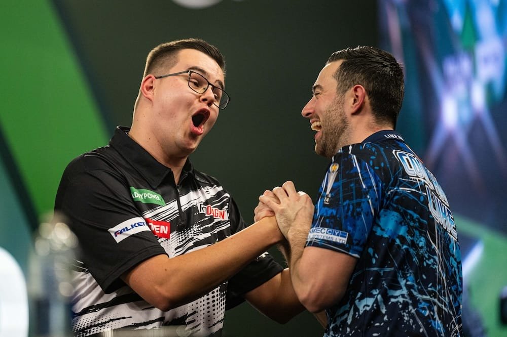 Luke Humphries congratulates Gian van Veen on his victory. Photo: Godfrey Pitt/Action Plus Sports via ZUMA Press Wire