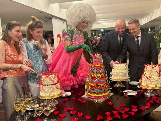 But it was all celebration and champagne at Wednesday’s joint wedding, with legendary Dutch drag queen personality Dolly Bellefleur cutting one of the four wedding cakes on offer.
